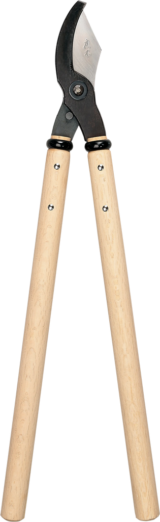 Traditional Japanese lopping shears with big strong forged blades and stout oak handles. No messing about with squidgy shock absorbers - the oak handles take care of that - or adjustable, ratchet jiggery pokery, just the very pleasing action of properly forged carbon steel at work. Suitable for branches up to 1", although as some species are harder than others this is only a guide, and common sense should tell you when to stop. Attack larger branches at a 45˚angle and whatever you do, do not rely on the handles to do the cutting – they are wood and you can snap them with enough lever pressure. If the blades aren’t coping, sharpen them and try again.